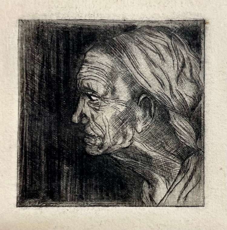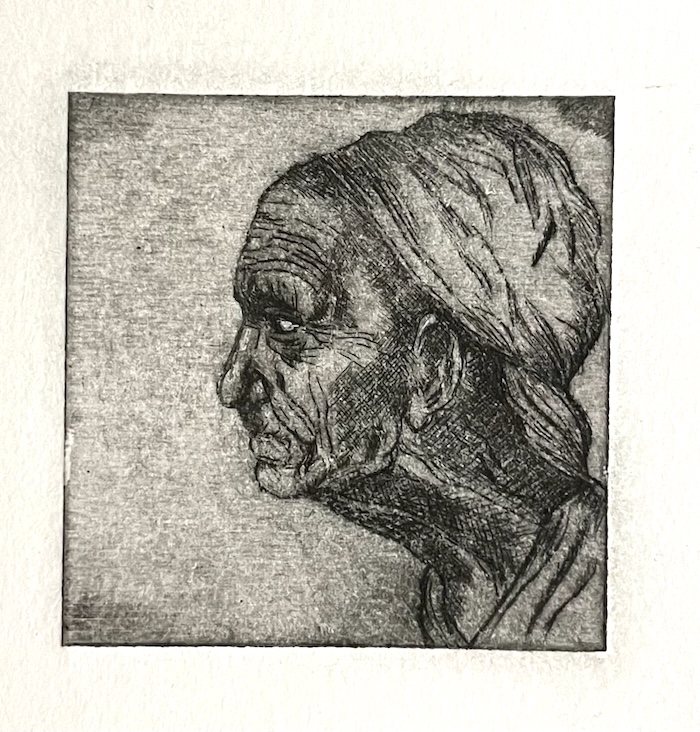 Kaltnadelradierung, Zink, (5x5 cm) Druck, Adaption, Detail: Judith enthauptet Holofernes, Caravaggio, um 1599 —