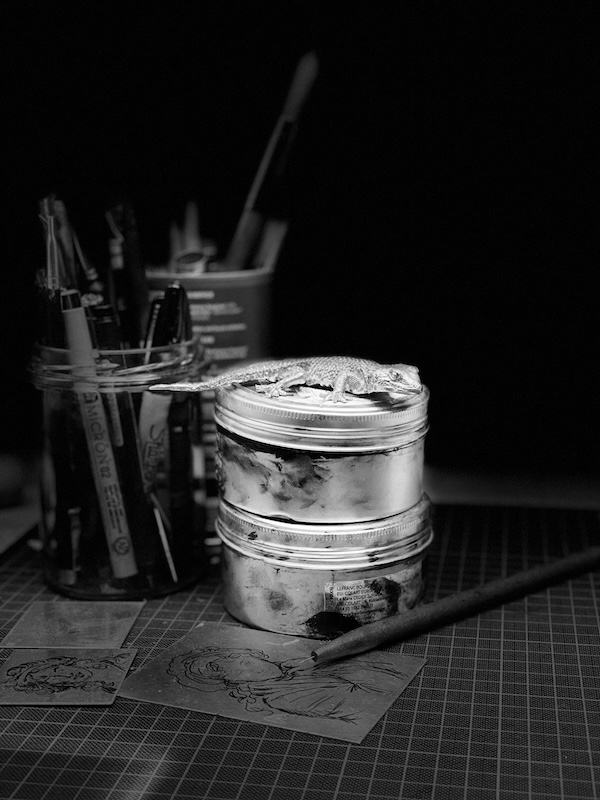 Radiernadeln, Zinkplatten, schmutzige Finger, eine kleine Druckpresse. Und digitale Tools, wenn sie nützlich sind. Das ergibt am Ende das, was man hier sieht.