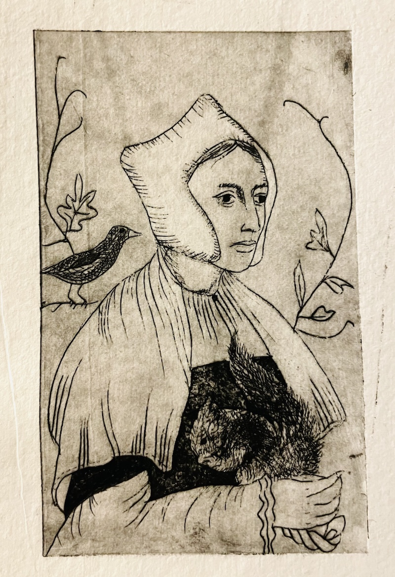 Tetrapak-Druck, Adaption nach Hans Holbein d. J., "Porträt einer Dame mit einem Eichhörnchen und einem Star", wahrscheinlich Anne Lovell, 1526