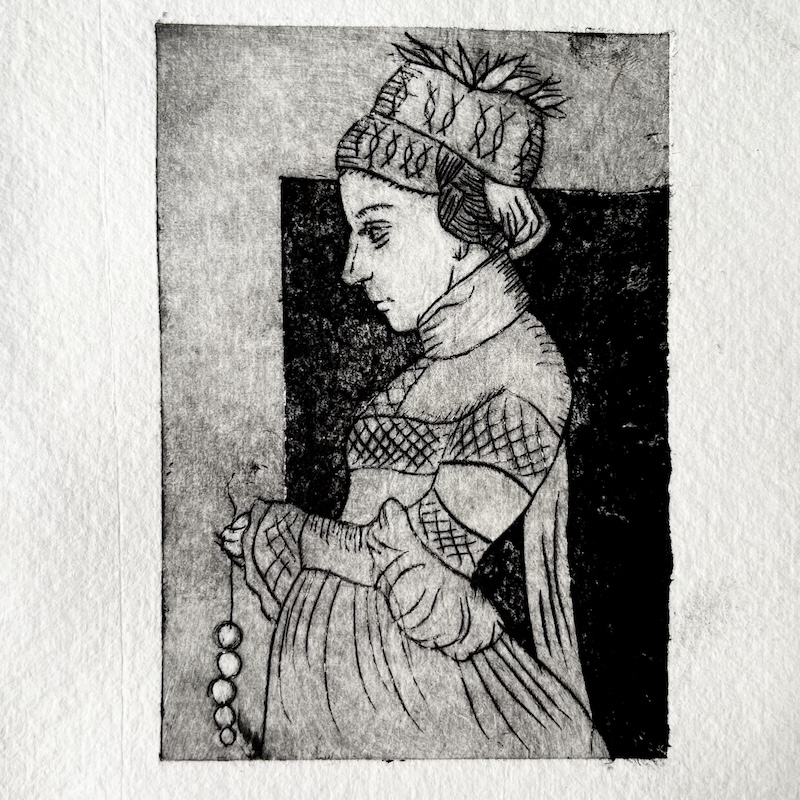 Langsam wurde ich sicherer im Umgang mit dem Material. Details musste ich weglassen – oder zumindest reduzieren. Ein kleiner Satz Stanzeisen und ein Gummihammer erweiterten mein Werkzeug, damit konnte ich auch aufwändige Kleidungsornamente und Schmuckstücke der Renaissance-Frauen in vereinfachter Form darstellen. Dabei stieß ich bald auf Hans Holbein den Jüngeren. Besonders die Kopfbedeckungen der Frauen in seinen Gemälden faszinierten mich. Begriffe wie „Jungfern-Schapel“ konnte ich nicht einfach überlesen. Ich wollte wissen, was das genau bedeutet – und schon führte eins zum anderen.