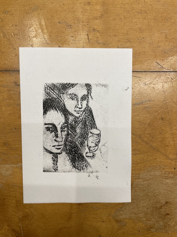 Im Februar 2024 entdeckte ich an einem Wochenende, spät abends, auf Instagram @kitchengravurebylea. Kaltnadelradierungen auf Tetrapaks, gedruckt mit einer Nudelmaschine. Eine Technik, die ich bisher nur in Kindergärten verortet hatte, wurde dort zu etwas, das ich unbedingt ausprobieren wollte. Sofort! Am gleichen Abend noch probierte ich es mit dem, was da war: Linoldruckfarbe, billiges Aquarellpapier und ein Nudelholz. Es klappte nur so mittel, aber ich war angefixt. Drei Tage später stand die erste Nudelmaschine in meiner Küche. Am 2. März hatte ich schon ein besseres Modell – und im Juni ´24 später traute ich mich, erste Ergebnisse auf Instagram zu veröffentlichen. Die Reichweite blieb sehr klein, die Freude an der Technik dagegen enorm groß.