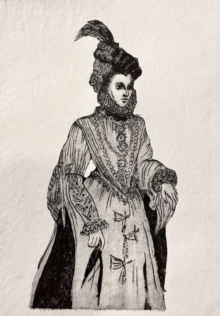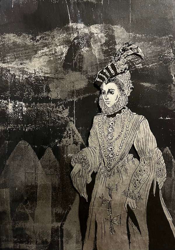 Die Cut-Out-Druckplatte erinnerte mich an Anziehpuppen aus Papier, und ich experimentierte nochmal mit Monoprint-Hintergründen, stilistisch irgendwo zwischen Renaissance und 19. Jahrhundert, fast schon Steampunk. Die Platte hatte ich versehentlich seitenverkehrt angelegt – der Druck selbst war also nicht seitenrichtig, das Experiment hingegen schon. —