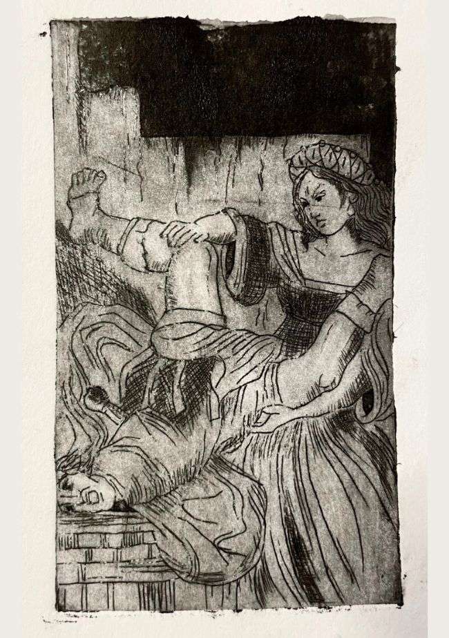 Tetrapak-Druck, Adaption, Detail, Elisabetta Sirani – Timokleia tötet den Hauptmann Alexanders des Großen, 1659 —